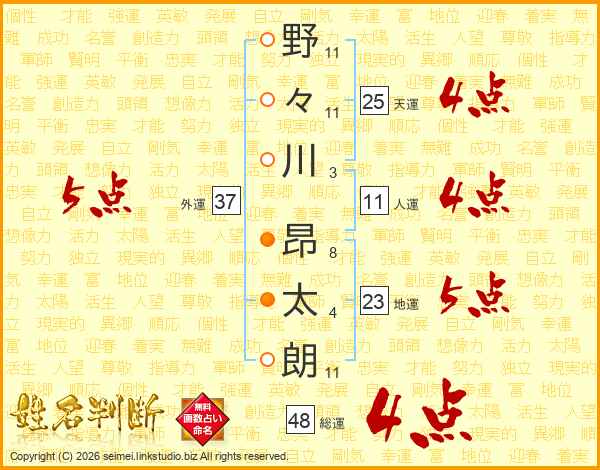 野(11画)々(11画)川(3画) 昂(8画)太(4画)朗(11画)