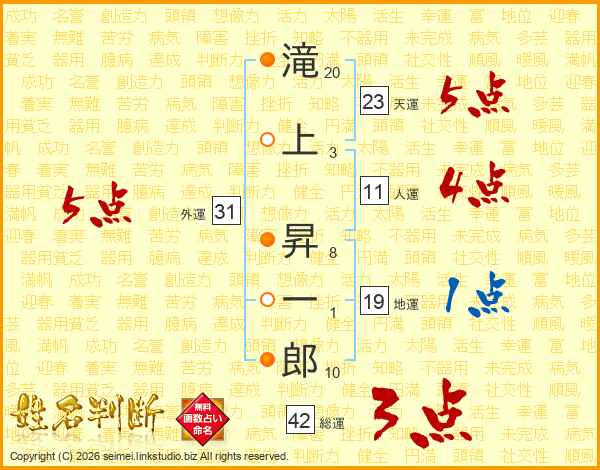 滝(20画)上(3画) 昇(8画)一(1画)郎(10画)
