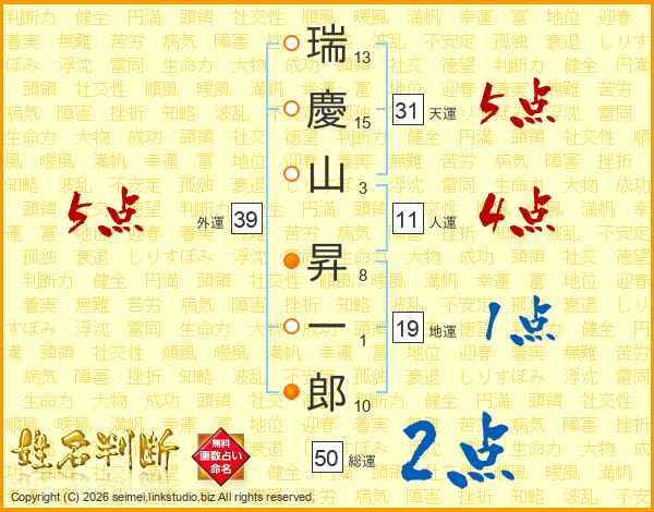 瑞(13画)慶(15画)山(3画) 昇(8画)一(1画)郎(10画)