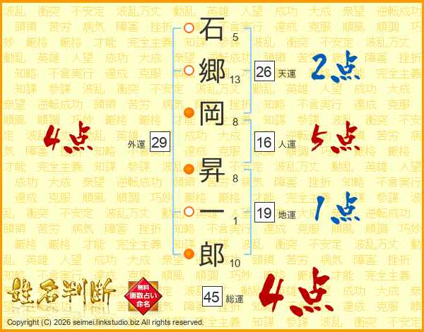 石(5画)郷(13画)岡(8画) 昇(8画)一(1画)郎(10画)