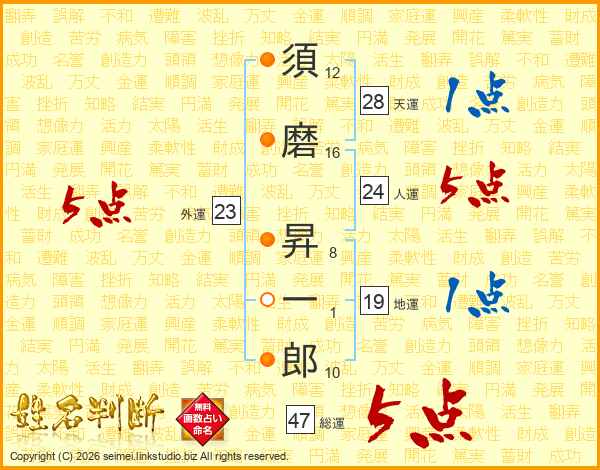 須(12画)磨(16画) 昇(8画)一(1画)郎(10画)