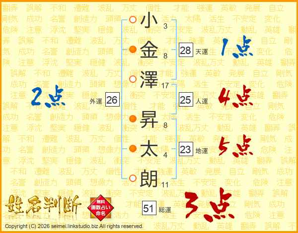 小(3画)金(8画)澤(17画) 昇(8画)太(4画)朗(11画)
