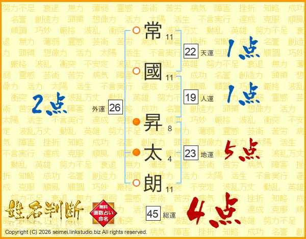 常(11画)國(11画) 昇(8画)太(4画)朗(11画)