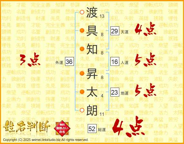 渡(13画)具(8画)知(8画) 昇(8画)太(4画)朗(11画)