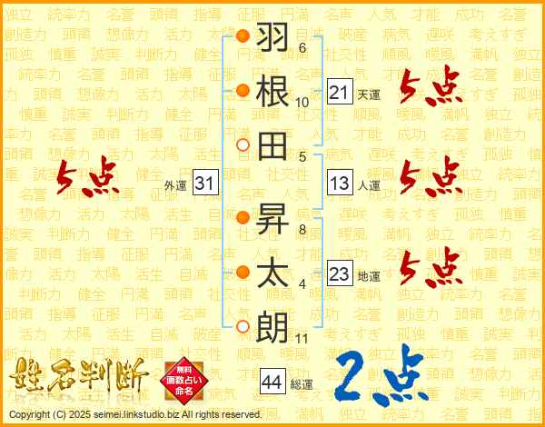 羽(6画)根(10画)田(5画) 昇(8画)太(4画)朗(11画)