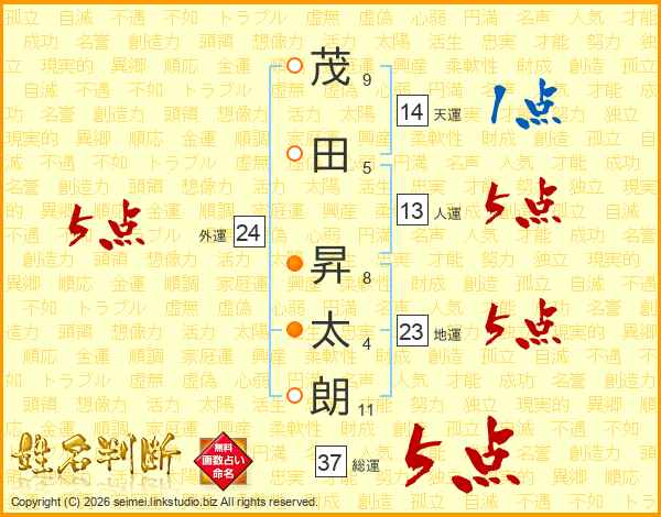 茂(9画)田(5画) 昇(8画)太(4画)朗(11画)