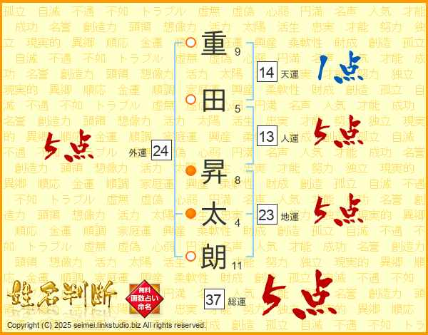 重(9画)田(5画) 昇(8画)太(4画)朗(11画)