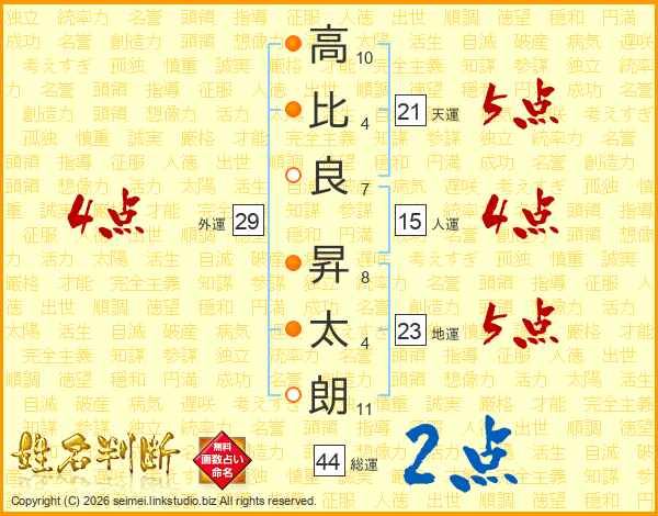 高(10画)比(4画)良(7画) 昇(8画)太(4画)朗(11画)
