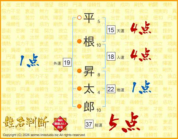 平(5画)根(10画) 昇(8画)太(4画)郎(10画)