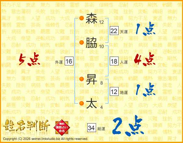 あなたの人生を表す1番重要な運勢です。生涯を通じて影響する総合運となり、主に50歳以降の晩年期に影響を及ぼします。苗字と名前の合計画数。