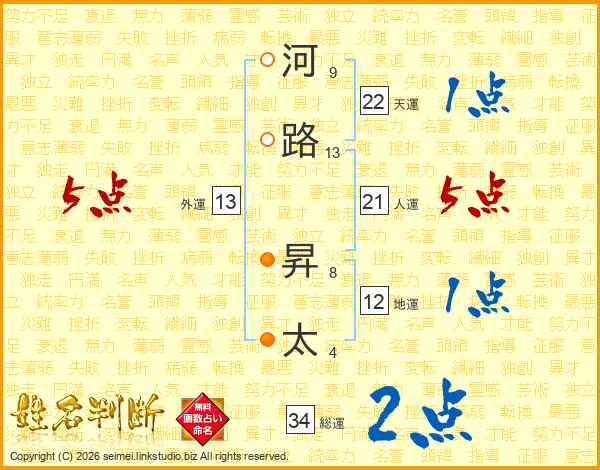 生活面を象徴する運勢です。外部から受ける影響力を表し、結婚運、家庭運や職場、環境への順応性を表します。総運から人運を引いた画数。姓や名が1文字の場合を除く。
