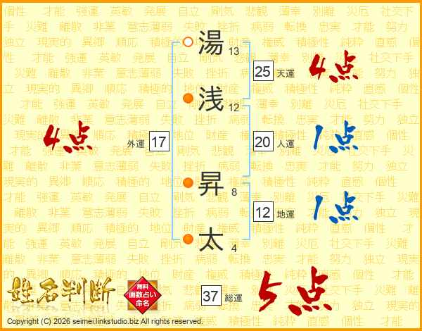 湯(13画)浅(12画) 昇(8画)太(4画)