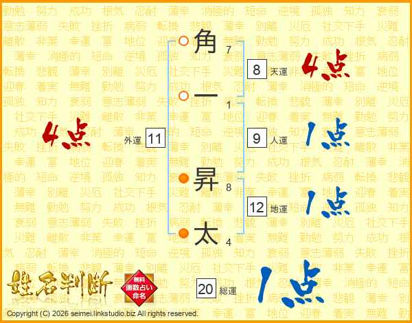 家系が持つ宿命的な運勢を表します。祖先から受け継いだ苗字ですので自分の力が及びません。家柄を象徴します。苗字の合計画数。