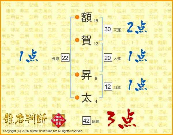 額(18画)賀(12画) 昇(8画)太(4画)