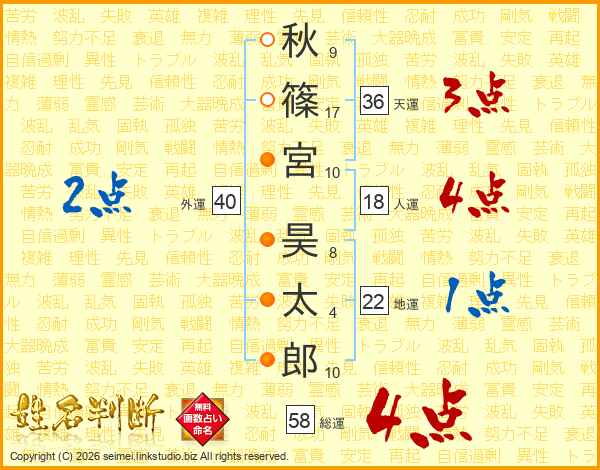 秋(9画)篠(17画)宮(10画) 昊(8画)太(4画)郎(10画)