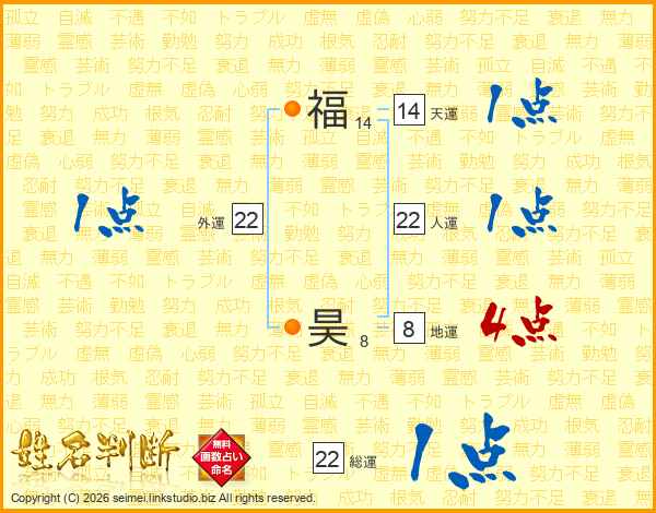 生活面を象徴する運勢です。外部から受ける影響力を表し、結婚運、家庭運や職場、環境への順応性を表します。総運から人運を引いた画数。姓や名が1文字の場合を除く。