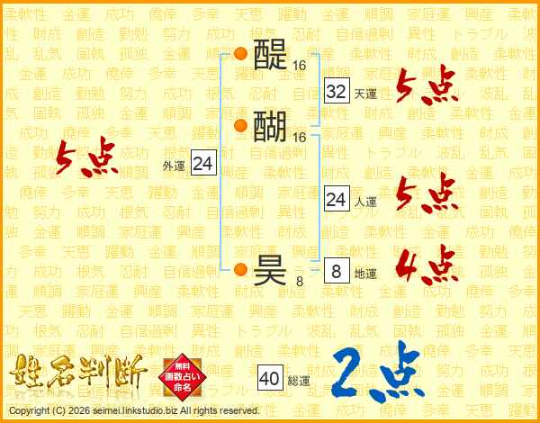 生活面を象徴する運勢です。外部から受ける影響力を表し、結婚運、家庭運や職場、環境への順応性を表します。総運から人運を引いた画数。姓や名が1文字の場合を除く。