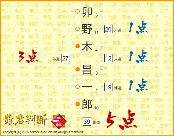 卯(5画)野(11画)木(4画) 昌(8画)一(1画)郎(10画)