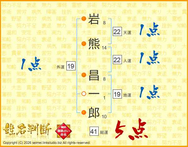 岩(8画)熊(14画) 昌(8画)一(1画)郎(10画)