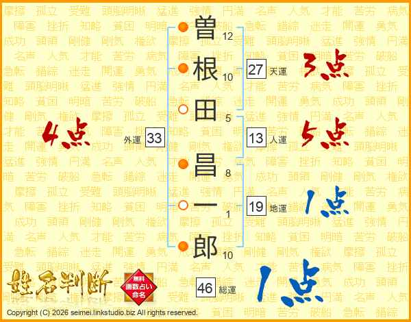 曽(12画)根(10画)田(5画) 昌(8画)一(1画)郎(10画)