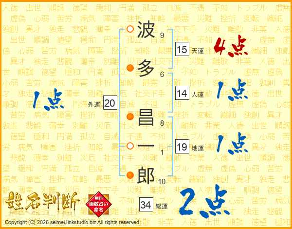 波(9画)多(6画) 昌(8画)一(1画)郎(10画)