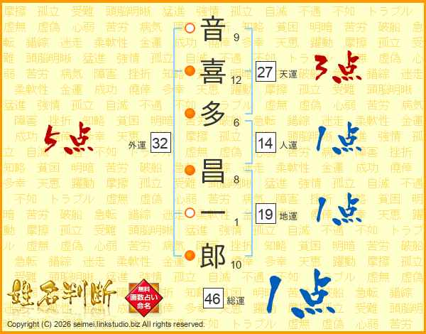 音(9画)喜(12画)多(6画) 昌(8画)一(1画)郎(10画)