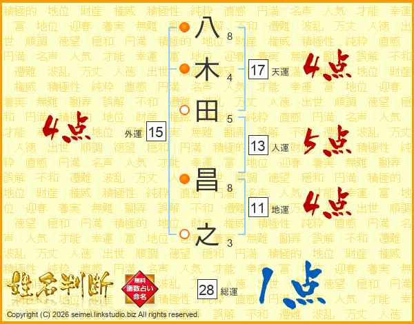 八(8画)木(4画)田(5画) 昌(8画)之(3画)