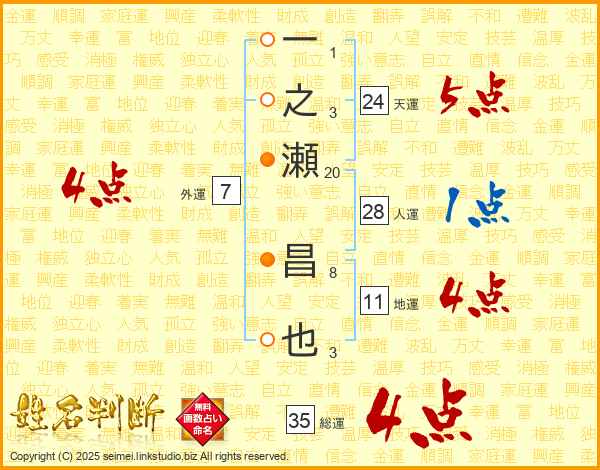 一(1画)之(3画)瀬(20画) 昌(8画)也(3画)