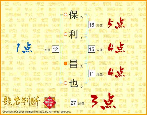 保(9画)利(7画) 昌(8画)也(3画)
