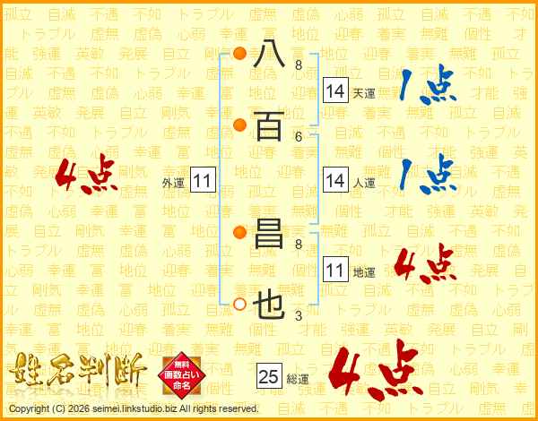 生活面を象徴する運勢です。外部から受ける影響力を表し、結婚運、家庭運や職場、環境への順応性を表します。総運から人運を引いた画数。姓や名が1文字の場合を除く。