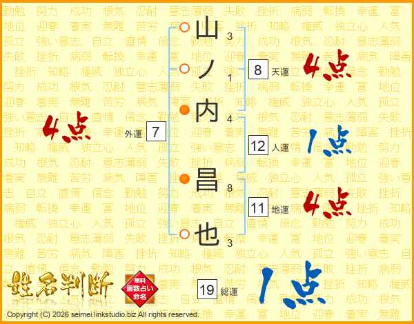 山(3画)ノ(1画)内(4画) 昌(8画)也(3画)