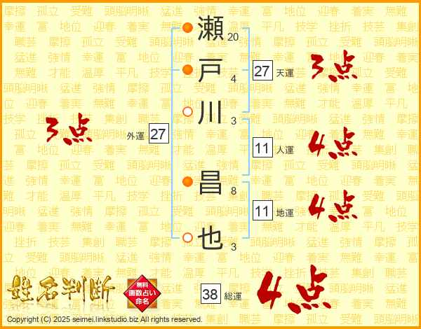 瀬(20画)戸(4画)川(3画) 昌(8画)也(3画)