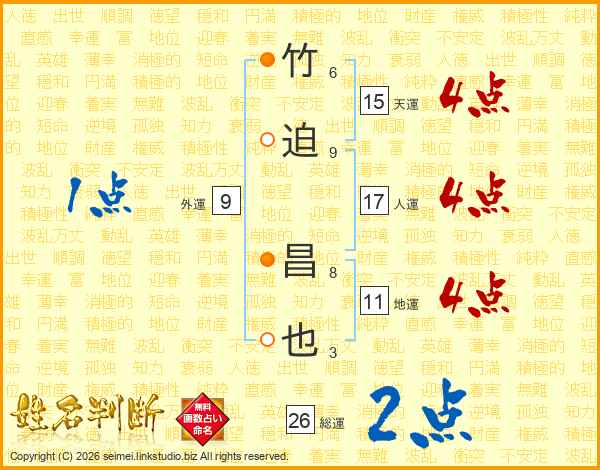 竹(6画)迫(9画) 昌(8画)也(3画)