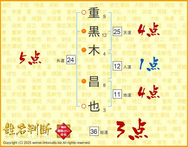 重(9画)黒(12画)木(4画) 昌(8画)也(3画)