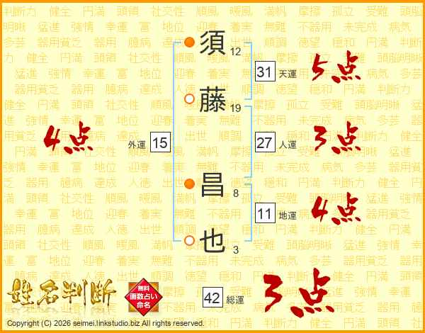須藤昌也さんの人運は27画の3点!
