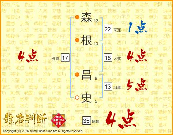 森(12画)根(10画) 昌(8画)史(5画)