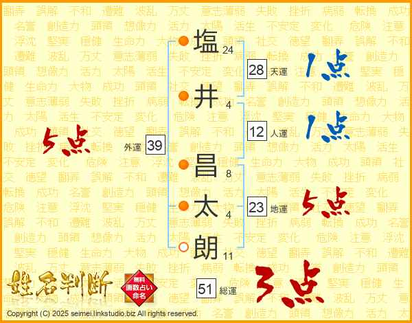 塩(24画)井(4画) 昌(8画)太(4画)朗(11画)