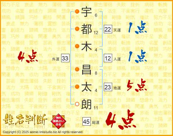 宇(6画)都(12画)木(4画) 昌(8画)太(4画)朗(11画)