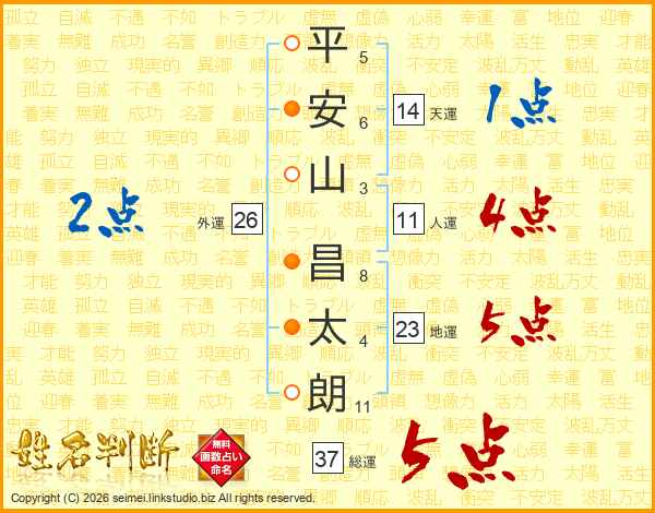 平(5画)安(6画)山(3画) 昌(8画)太(4画)朗(11画)