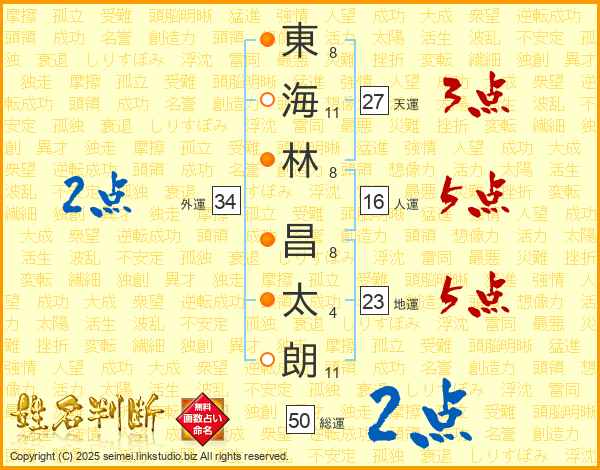 東(8画)海(11画)林(8画) 昌(8画)太(4画)朗(11画)