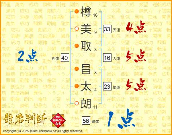 樽(16画)美(9画)取(8画) 昌(8画)太(4画)朗(11画)