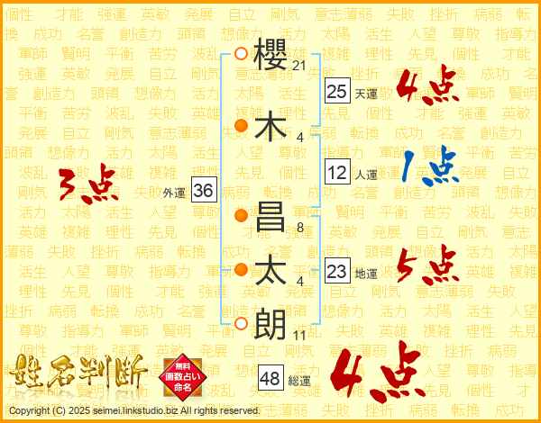 櫻(21画)木(4画) 昌(8画)太(4画)朗(11画)