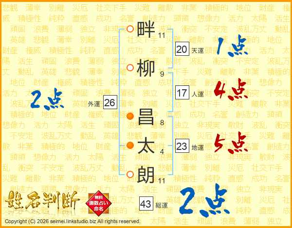 畔(11画)柳(9画) 昌(8画)太(4画)朗(11画)
