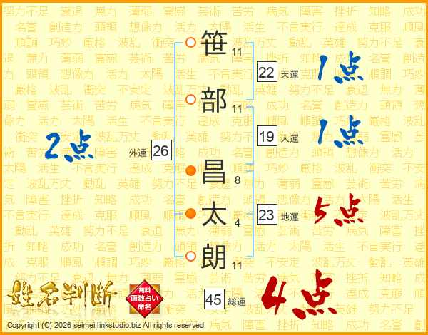 笹(11画)部(11画) 昌(8画)太(4画)朗(11画)