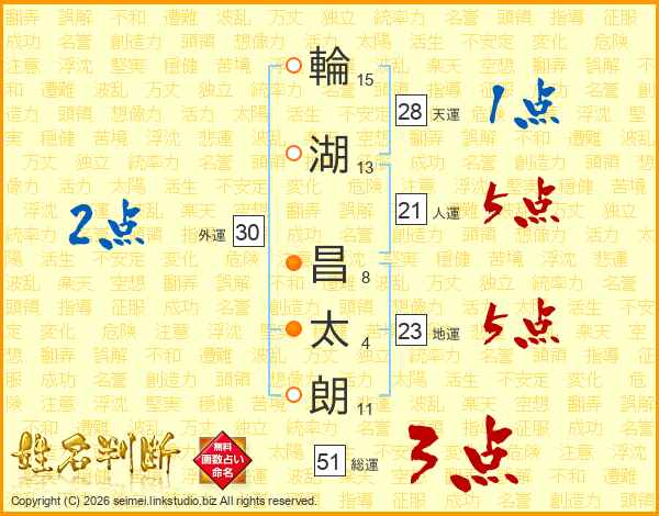 輪(15画)湖(13画) 昌(8画)太(4画)朗(11画)