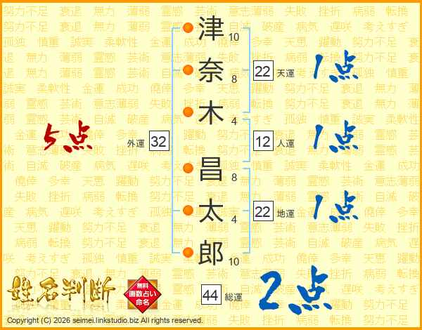 津奈木昌太郎さんの総運は44画の2点!