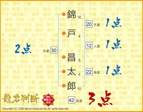 錦(16画)戸(4画) 昌(8画)太(4画)郎(10画)