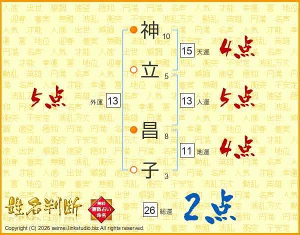 神(10画)立(5画) 昌(8画)子(3画)