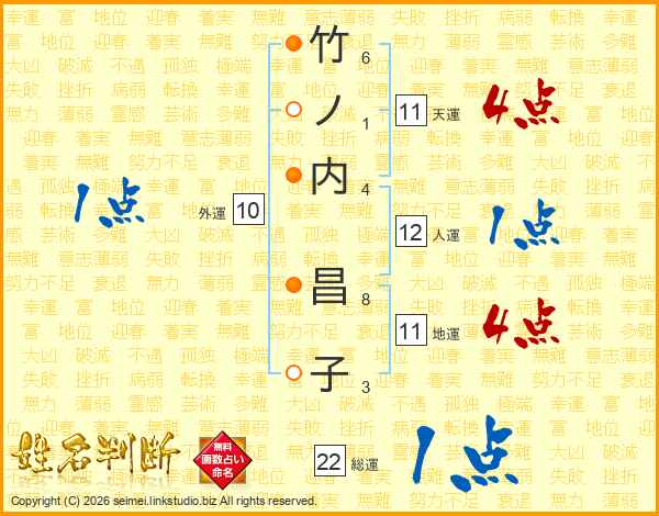 竹(6画)ノ(1画)内(4画) 昌(8画)子(3画)