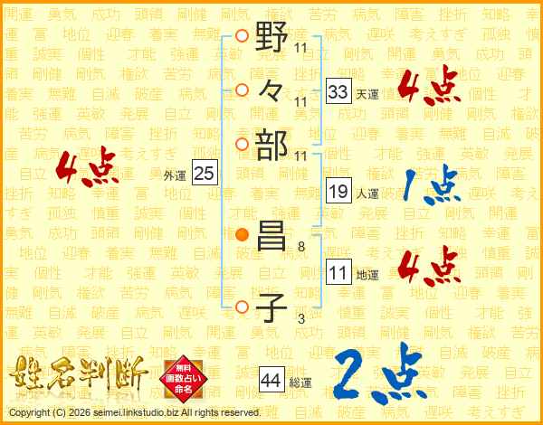 野(11画)々(11画)部(11画) 昌(8画)子(3画)